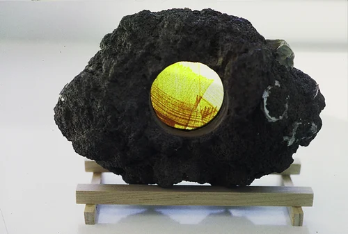Initially inspired by a trip to Ireland, stonewindows became a series of small movable windows. Made from river stones, shist, granite, scoria, etc., they incorporate several layers of glass, painted and sandblasted, full of surprise and serendipity.
